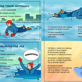 - на лед надо наползать, стараясь не ломать кромку. Широко раскидывай руки. Сначала лед может ломаться. Пусть это не приводит тебя в отчаяние. Ты знаешь, что это бывает, поэтому не сдавайся. Надо наползать на кромку снова и снова. Очень важно не погрузиться в воду с головой!
