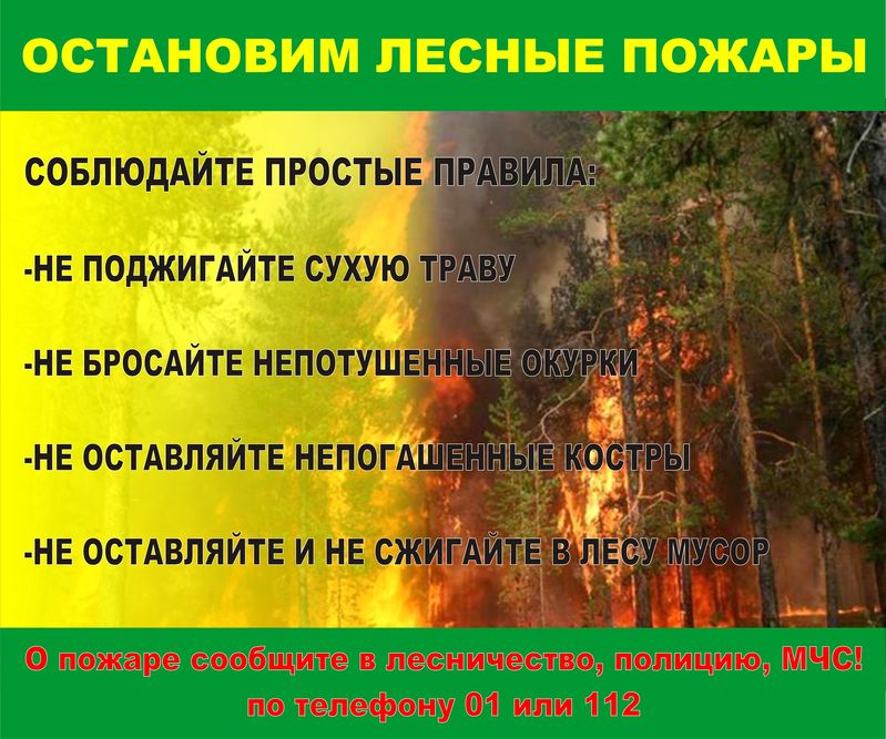 - после выхода из зоны пожара сообщите о месте, размерах и характере в противопожарную службу, администрацию населенного пункта, лесничество.