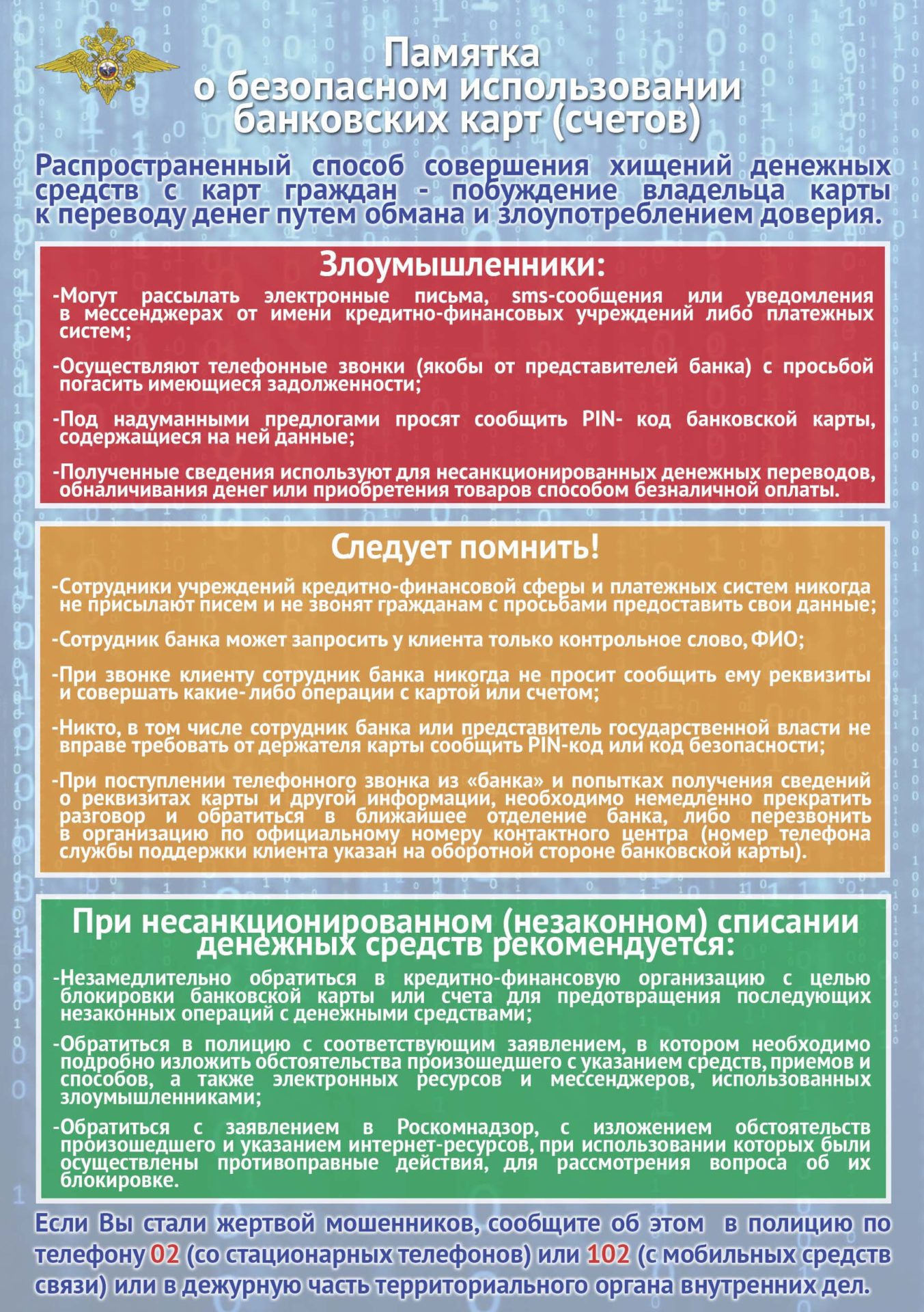 МВД предупреждает — памятки 18.07.2023 10 Скачать документ PDF (232.7 KB) Скачать документ PDF (163.4 KB) Скачать документ PDF (328.4 KB) Скачать документ PDF (344.4 KB) Скачать документ PDF (314.7 KB) Скачать документ PDF (468.6 KB) Скачать документ PDF (258.6 KB) Скачать документ PDF (108.5 KB)